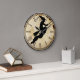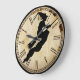 A graphic design to look like a vintage clock face with a Halloween season theme. A black silhouette of a witch flying on a broom is in front of a weathered, rusted clock face.