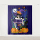 A witch all dressed up in purple and orange with a sugar skull day of dead make-up on. Black cat, pumpkins, cauldron and a full moon