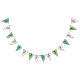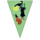 Bunting flag with a Halloween witch riding her broom. She has a couple of passengers on her broom. A jack - o - lantern and black cat have hitched a ride. There is a full moon behind them. The background colours alternate from white to teal to green. The perfect addition to your Halloween party.