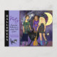 Magical Halloween Hocus Pocus-inspired design on Happy Wishing Halloween Postcard. This card features 3 witches, a tree, an owl, a brewing pot with a skeleton hand sticking out of the pot, and a cat, and the background is purple watercolor with moonlight.