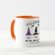 Cute cartoon illustration of Halloween themed gnomes holding a trick or treat candy bucket, spiderweb, and a broom.