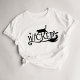 White witchy t-shirt with wicked graphic text with broom, bat and black cat.