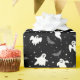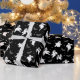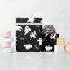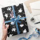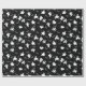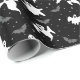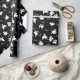Halloween wrapping paper is shown in a black and white ghosts print.