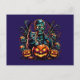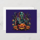 Halloween zombie and his zombie cat with skulls and jack-o'-lanterns.