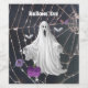 Halloween mood with ghost, bats, purple pumpkin, spiderweb.