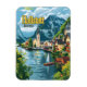 A picturesque and nostalgic portrayal of Hallstatt, Austria, renowned for its stunning alpine scenery, historic charm, and picturesque lakeside setting. The design captures the village's iconic pastel-coloured houses reflected in the tranquil waters of Hallstätter See (Lake Hallstatt), surrounded by towering mountains. Rendered in a vintage style, the artwork evokes the serene beauty and timeless allure of Hallstatt, inviting viewers to experience its idyllic landscapes and rich cultural heritage.