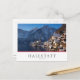 Photo postcard of the town of Hallstatt covered in snow at the lakeside of the Hallstätter See lake with Alps mountains in the background in the first light of the sunrise in a winter landscape in Austria with a white edge and in a white box with stripes in red, white and red, the colours of the Austrian flag, the text 'Hallstatt, Austria'.