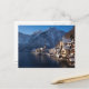 Photo postcard of the town of Hallstatt covered in snow at the lakeside of the Hallstätter See lake with Alps mountains in the background in the first light of the sunrise in a winter landscape in Austria.