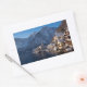 Rectangular photo sticker of the town of Hallstatt covered in snow at the lakeside of the Hallstätter See lake with Alps mountains in the background in the first light of the sunrise in a winter landscape in Austria.