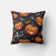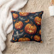 This Halloween cushion features a lively and whimsical pattern that perfectly captures the spirit of the season. The background is a deep, starry night blue, providing a striking contrast to the vibrant orange pumpkins scattered throughout the design. Each pumpkin is uniquely carved with playful, mischievous faces, showcasing a range of expressions from cheeky grins to spooky smiles.