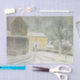 This design features a painting by the British artist Eric Ravilious (1903–1942). It depicts a local road in rural England during a snowy winter. There is a grand house painted yellow in the middle of the scene. There are some smaller houses towards the right. The trees are bare; the leaves have already fallen from their branches. Snow is falling from the sky, and the ground is white with snow that has already fallen. There are some tyre marks on the road where cars or bicycles have ridden through the snow. The original artwork was painted by Eric Ravilious in 1935.