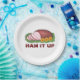 Plates feature an original marker illustration of a glazed sliced holiday ham on a platter with pineapples, and HAM IT UP in a fun font. Ideal for Christmas celebrations. Matching napkins available!