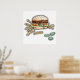 A fun illustration of the American classic drive-in and diner fare, a burger and fries with a sesame seed bun, tomatoes, lettuce, ketsup and a few pickle chips included by Pop Art Diva.