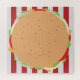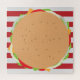 Features a cheeseburger with all the trimmings on a red and white striped background.