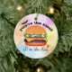 You're the meat, I'm the bun funny foodie Christmas ornament for sandwich or hamburger lovers featuring a cheeseburger with fixings and sesame seed bun personalized with your custom text.