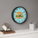 This clock features a delicious cartoon illustration of a hamburger. The burger is made of meat, green lettuce, red tomatoes, onion, slice of cheese and a few pickles. The bun looks freshly baked and it has some sesame seeds on top of it. The clock face is made of stylish black numbers.