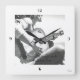 Personalizable wall clock with centre photo, shown with black and white female guitar player and text. Call 203-302-0337 for help or with questions.