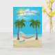 Hammock hanging between two palm trees with starfish, cocktail drink, and flip-flops on ocean beach sand with summer clouds for 21st birthday.