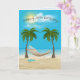 Hammock hanging between two palm trees with starfish and flip-flops on ocean beach sand with summer clouds for 45th birthday.