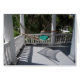 The morning sun casts shadows on this southern porch, where a hammock awaits. On the back of the card, three rocking chairs are lined up on a porch, ready for occupants.