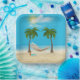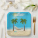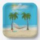 Hammock hanging between two palm trees with starfish, cocktail drink, and flip-flops on ocean beach sand with summer clouds.