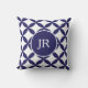 Hamptons style cushion with a modern navy blue and white geometric circles pattern, with a monogram circle on the front to add your own initials