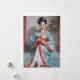 A woman wearing traditional East Asian attire sits gracefully, with her eyes downcast and hands gently holding the fabric of her robe. The intricate patterns and bright colours of her garment stand out against a softly blurred background that includes floral details.