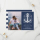 Announce your wedding to family and friends with these coastal chic save the date cards in classic navy blue and greyed off-white. Design features your favourite photo alongside a hand-drawn ship's anchor illustration with "kindly save the date" inscribed inside. Personalise these nautical save the date cards with your names, wedding date, location and wedding website, or an indication that a formal invitation will follow. Cards reverse to wide horizontal navy stripes.