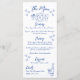 European Inspired Blue and White Whimsical Wedding Dinner Menu. This enchanting wedding menu card features a charming design inspired by Italian, French, and European aesthetics. A hand-drawn place setting illustration graces the top, while a champagne bottle and glass at the bottom are accented with scattered hearts for a romantic and elegant touch. The front highlights your menu details in a mix of handwritten script and simple fonts, offering a whimsical yet refined feel to your celebration.