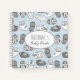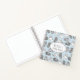 Modern personalised baby book with an illustrated black and white pattern of different styles of baby booties on a pastel blue background.