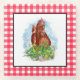 A chicken sitting in clover and flowers hand drawn sketch. Cute gift for your favourite chicken mum. Yellow and red chequered gingham back.