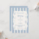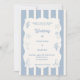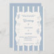 A hand drawn style wedding invitation with beach, coastal theme. A soft ivory and dusty blue striped colored background, with an ivory frame and dusty coastal blue elements. Personalize and add your names and the details.