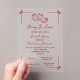 The transparent acrylic background creates a light, airy, and upscale aesthetic, allowing the whimsical red artwork and feminine typography to stand out with a clean, modern finish. This invitation perfectly balances soft, romantic details with a trendy, fashion-forward vibe, making it ideal for brides who love quiet luxury, coquette, cottagecore, and vintage-inspired celebrations.