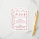 Surrounding the edges is a playful hand-drawn frame of wavy lines and swirls, creating a whimsical and lighthearted vibe while keeping the overall design clean and simple. The red colour scheme makes it a perfect fit for nautical-themed weddings or an old-school Italian-inspired theme, adding warmth and charm to your wedding stationery. The colours can also be customised to suit any wedding style.