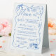 Elevate your wedding reception with our double-sided table tent menu sign, featuring whimsical hand-drawn illustrations with playful wavy and squiggly lines, this menu card adds a touch of artistic flair to your dining experience. One side showcases the dinner reception menu, while the other highlights the bar menu. This menu table tent sign beautifully complements your wedding decor while informing guests of the delicious dishes to come. Explore our coordinating items available in-store for a cohesive and stylish look. (c) Ever After Wedding
