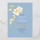 This feminine, modern, and romantic dusty blue wedding invitation is perfect for a variety of wedding styles. With hand-drawn flowers in a beautiful mix of colours - elegant white and sophisticated gold foil - it captures the timeless essence of love. The design creates a warm, inviting atmosphere that will charm your guests with its delicate tone and graceful details. You can personalise the gold foil graphics to rose gold or silver to match your style. The word "Wedding" in foil adds a touch of elegance but also looks stunning in white or dark grey. This fully customisable template lets you adjust the background and text colours to match your wedding theme. Simply click the 'Edit using Design Tool' button to make it your own, and feel free to add your photo to the backside too!