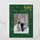 Send holiday cheer with this vertical Christmas card design featuring a rich emerald green front accented with gold foil details. The centered vertical photo is framed by a swirling ribbon-style doodle border in gold foil, with a hand-drawn coquette bow in the top right. “Merry Christmas” appears in gold foil script at the top left, and the bottom right includes space for your family name or individual names. All foil accents can be switched to silver or rose gold if you prefer a different look.