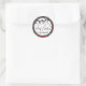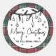 Festive Holiday Round Sticker. This cheerful round sticker features a doodle swag of pine greenery and hanging ornaments along the top, with scattered star doodles adding a playful touch. Set on a white background, “Merry Christmas” appears in elegant black script near the center, while a name or line of text is displayed at the bottom in a clean black font.