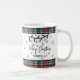 A red and green tartan plaid borders the top and bottom edges, adding a warm and festive touch to the design. Perfect for sipping your morning coffee, cocoa, or tea during the holidays. All text, fonts, and colors can be customized to match your personal style.