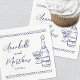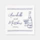 Personalised Hand Drawn Champagne Whimsical Wedding Napkins. This personalised wedding cocktail napkin features a charming and minimalist design, perfect for adding a special touch to your celebration. A delicate illustration of a champagne bottle and glass is prominently displayed in navy blue, symbolising the festive occasion. The bride and groom's names and wedding date are elegantly showcased beneath the artwork in a mix of handwritten script and simple font, creating a stylish yet approachable look. Styled in a timeless navy blue and white palette reminiscent of Italian, French, and European aesthetics, this design adds an extra layer of elegance.