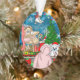 Pretty Christmas ornament with hand drawn little girl looking through store window that is festively decorated.