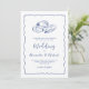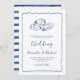 This whimsical coastal wedding invitation features a wavy scallop frame, hand drawn oyster shells, and handwriting script, with watercolor navy blue stripes on the back. It is perfect for Cape Cod weddings, or any east coast wedding on the rocky beaches from Maine to Nantucket and beyond.