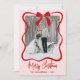 Send holiday cheer with this vertical Christmas card featuring a single centered photo framed by a simple swirling ribbon-style border. A hand-drawn coquette bow sits right at the top, with all ribbon and outline details in red for a clean, festive touch. Below the framed photo, “Merry Christmas” appears in red handwritten script, with space underneath to center your family name or individual names.