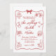 Quirky Hand-Drawn Whimsical Wedding Invitation. This artistic and playful design is perfect for couples looking to infuse their big day with a creative, lighthearted vibe. Styled in a red and white colour palette, it feels like a personal, hand-drawn masterpiece that is both charming and unique. A swirling, wavy frame adorned with a dainty bow draws attention to your wedding details, presented in a mix of script and handwritten-style fonts for a relaxed yet elegant touch.