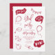 Funky graduation party invitation card featuring hand drawn illustration of graduation and school related icons in red.