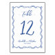 Blue Hand Drawn Quirky European Inspired Whimsical Wedding Table Number. This table number card is styled in a sophisticated blue and white palette inspired by French, Italian, and European aesthetics. It features a charming hand drawn swirl and loop border that adds a playful yet refined touch to your event. The whimsical frame gently highlights the table number, paired with a mix of script and handwritten fonts for a stylish and personalised design.