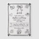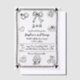 Blue and white floral garland wedding vellum overlay invitation. Announce your upcoming nuptials with this exquisitely quirky and whimsical wedding invitation. The design presents a delightful juxtaposition of a hand-drawn, black and white scribble style illustration set against a translucent vellum overlay, creating a vintage French aesthetic. The illustration is filled with playful details, featuring charming and loosely rendered doodles of hearts, a wedding ring, and a tied bow. A handwritten font adds an elegant yet informal touch, perfectly complementing the art. Further enhancing the design is a decorative frame, punctuated at each corner by small, lovingly crafted hearts, collectively creating a truly unique and memorable invitation.