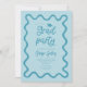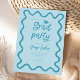 Funky graduation party invitation card featuring hand drawn squiggly and wavy frame. Blue background.