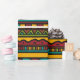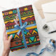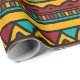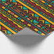 Versatile gift wrap has hand drawn tribal pattern with horizontal lines of geometric designs in earth tone colours