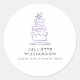 A clean, professional, and modern packaging sticker for cake designers and dessert bar stylists. This design features a whimsical hand drawn image of a three tiered cake in watercolor purple and business details in dark grey, against a bright white background.
